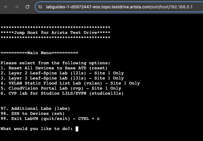 Welcome to the Arista ATD (1) Lab Environment. While there are several different ATD topologies that can be deployed, the ways to access various parts of the lab remain the same throughout. This guide will cover the different sections of the lab environment, as well as how to access the devices in the topology.