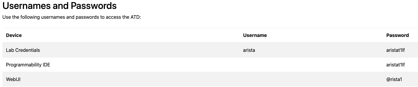 This contains all the credentials you would need to log in to the various devices and services in the ATD lab environment and are broken down as follows: