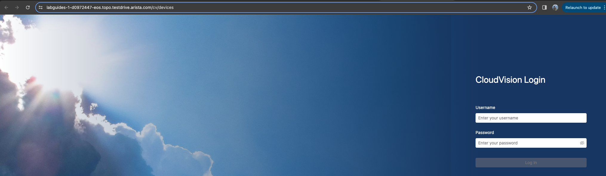 The CVP link will open the lab instance of CVP. Additionally, you can open CVP by clicking the CloudVision icon in the Topology network diagram. Upon clicking, a new window will open with the CVP login page:
