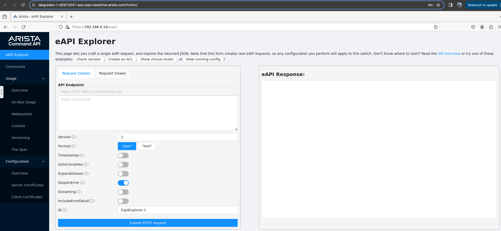 You can access the eAPI of any switch in the topology by entering https://[device mgmt IP] in the browser: