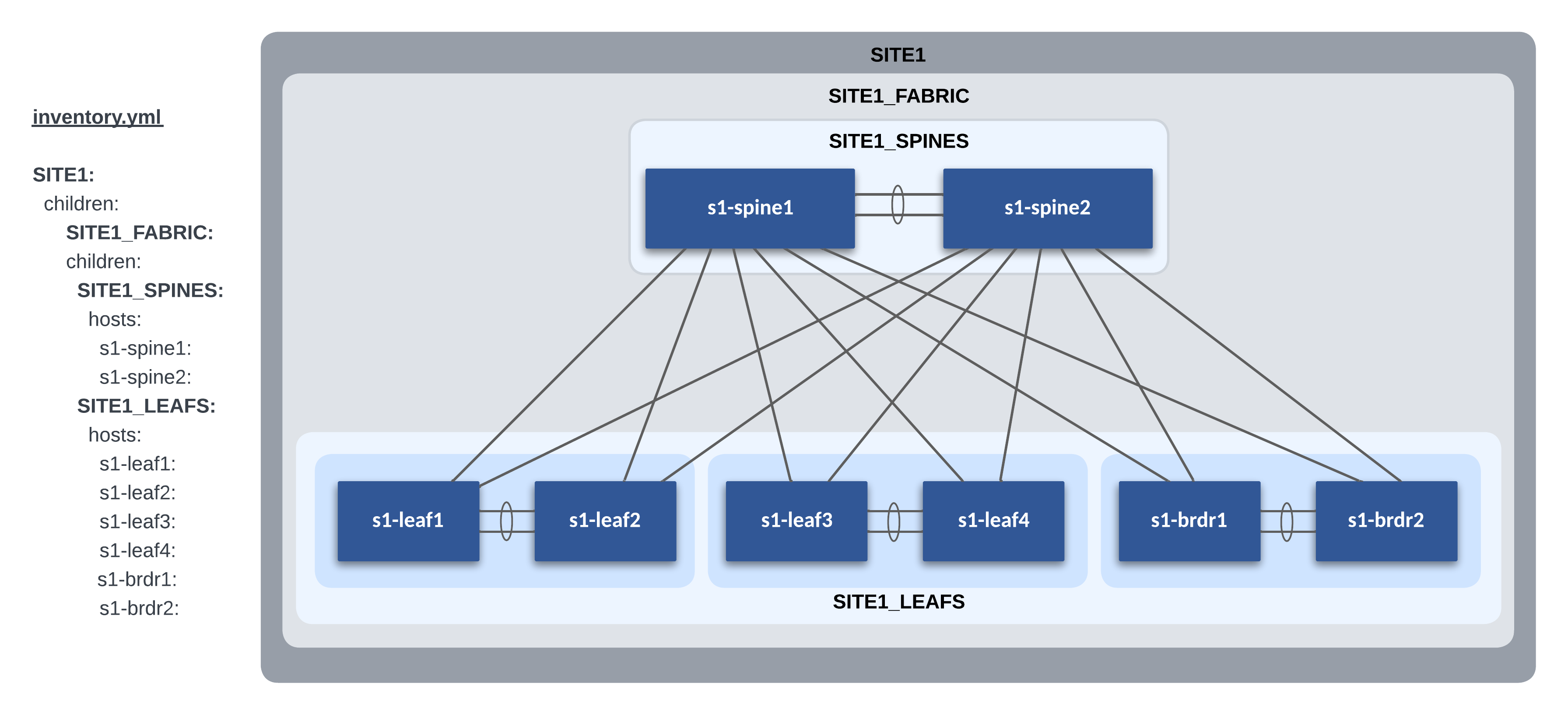 The following is a graphical representation of the Ansible inventory groups and naming scheme used for Site 1 in this example. This is replicated for Site 2.