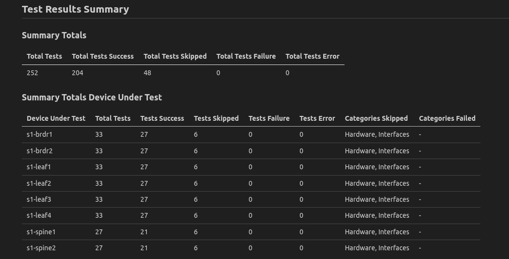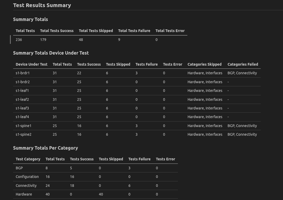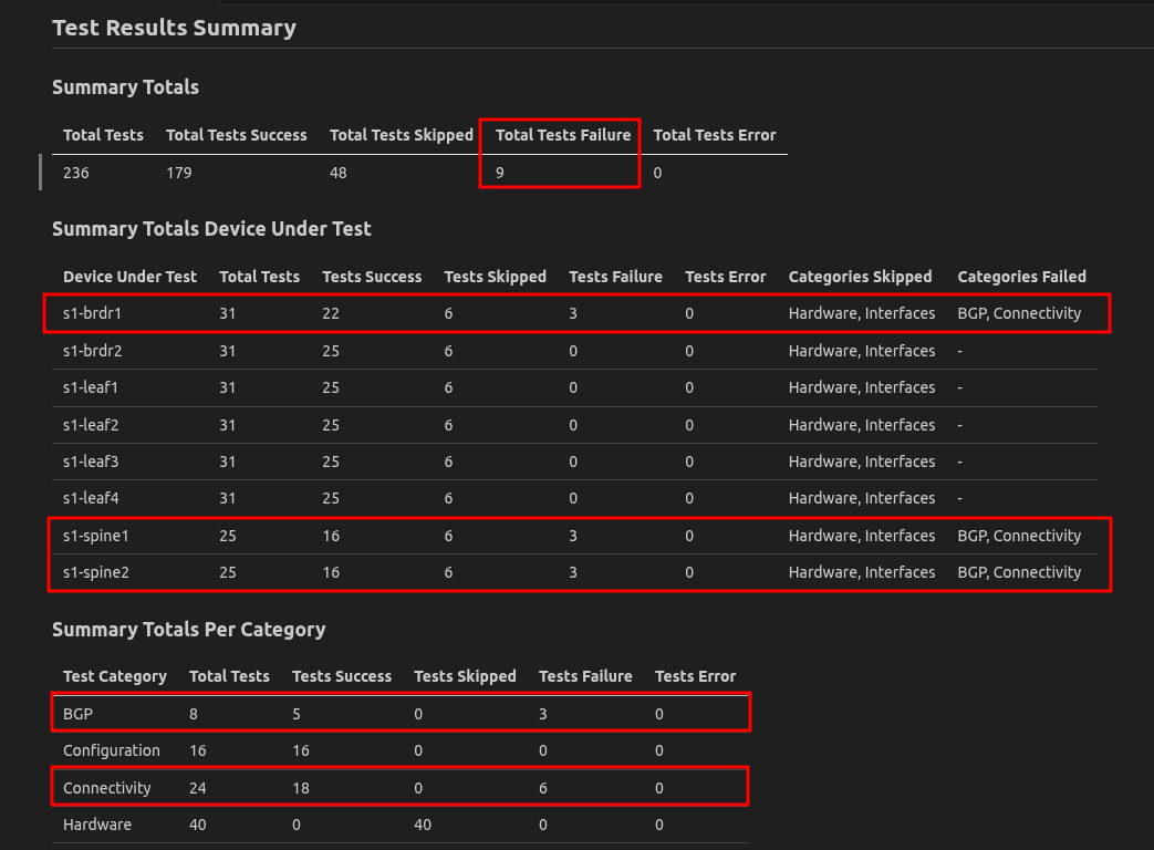 2. In the device summary, we can quickly discern that we have failures on the s1-brdr1 and both spine devices. The categories even give us hints as to what might be wrong here.