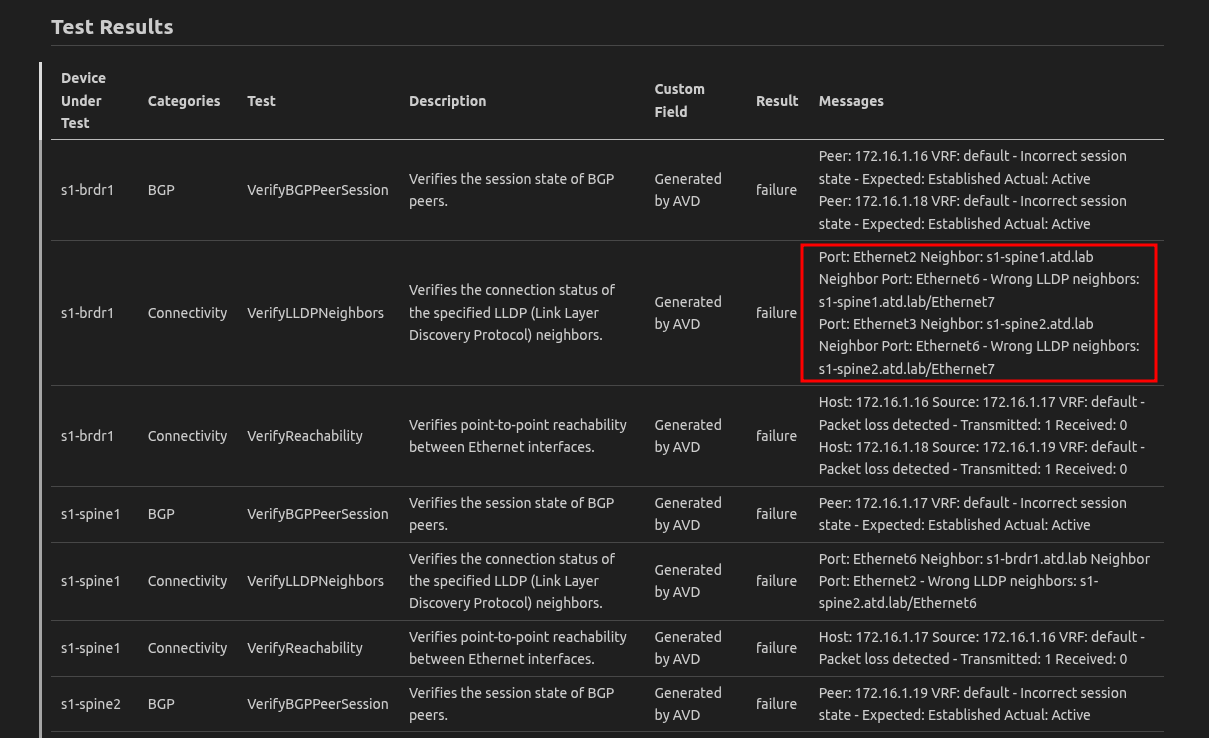 9. In a real-world scenario, this would have caught a use case of the links being transposed or a typo in the AVD repository! This is a virtual lab, so mistakes in cabling are most likely not the cause. Let's go fix AVD 😄