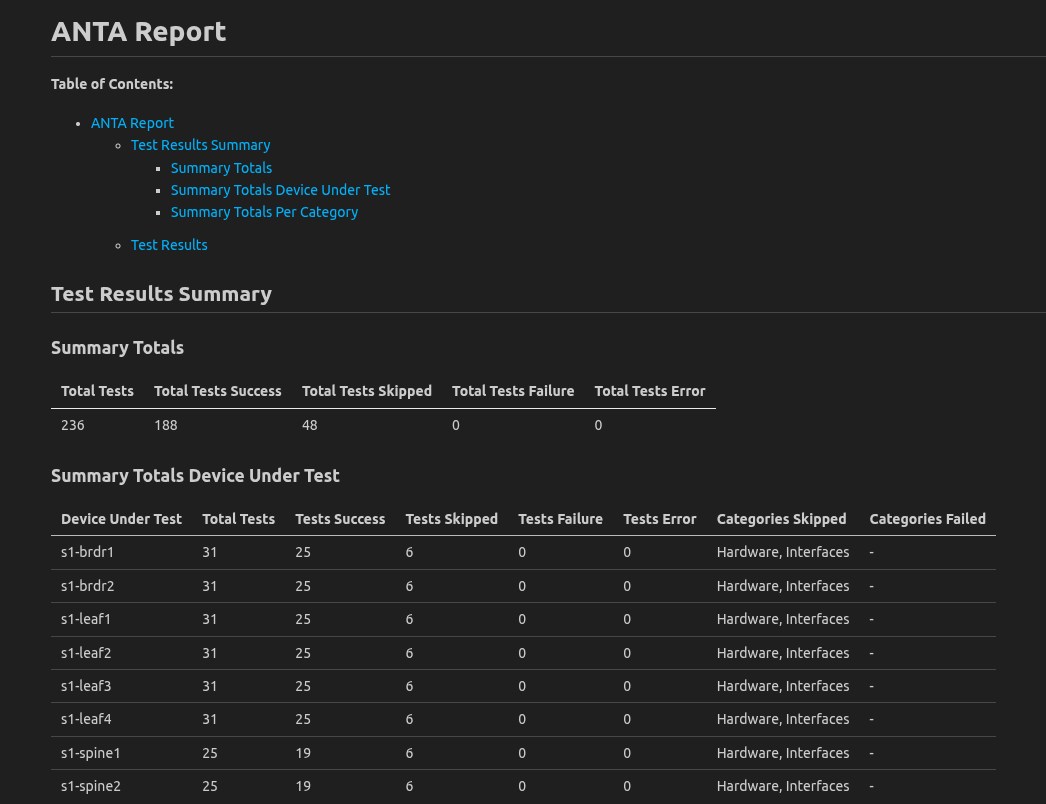 1. Open sites/site_1/anta/reports/anta_report.md and take a look at what the first part of this report shows
