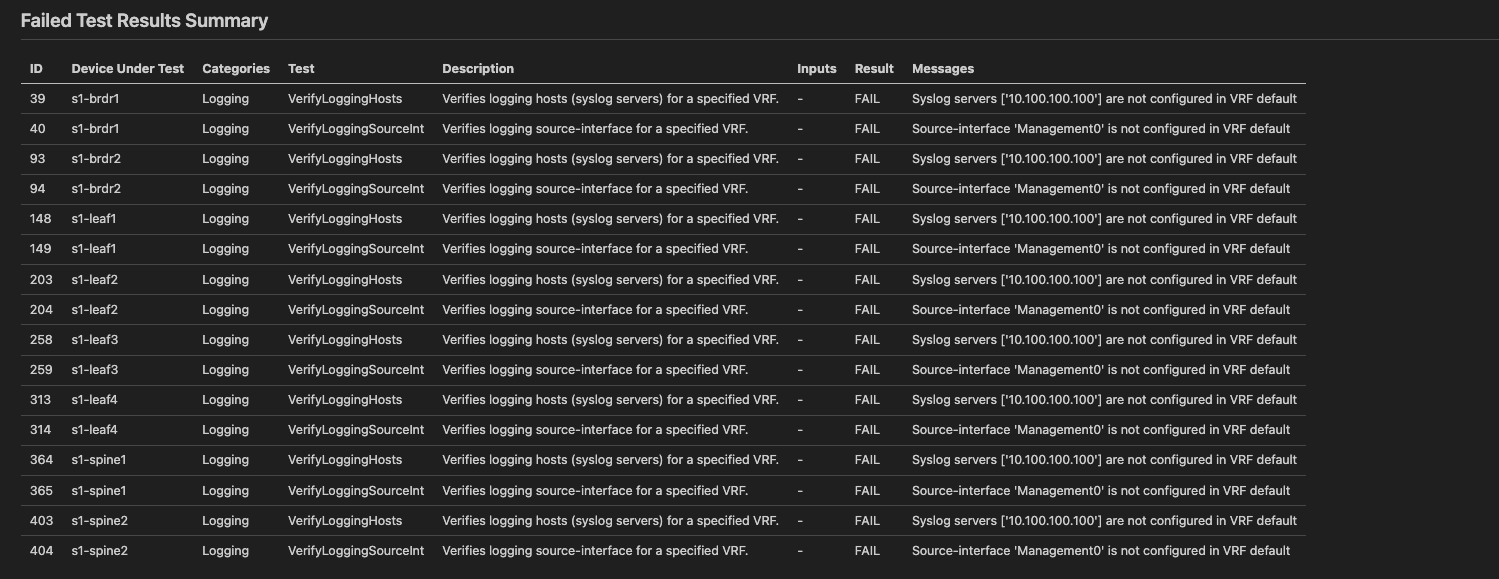 12. Awesome, you should no longer see any failures, we deployed the change and our test validated our entire SITE1 fabric is configured correctly. We can hand this automation and report to prove we've configured logging servers correctly!