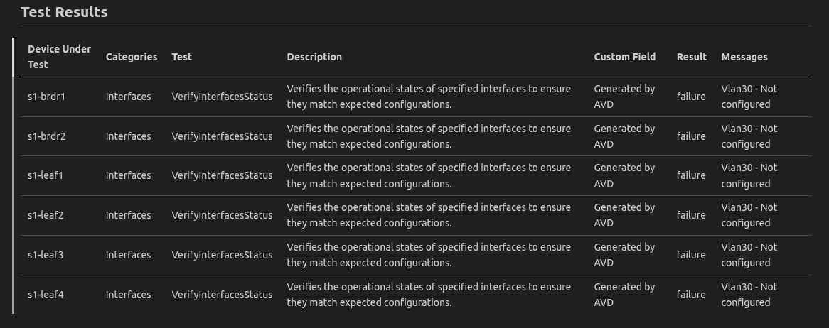 7. There's a new test for VLAN 30! Yes, AVD generated a test for you based on your AVD change. Yes, it failed because we told our validation to make sure the network has VLAN 30 configured and up... well we haven't deployed yet!