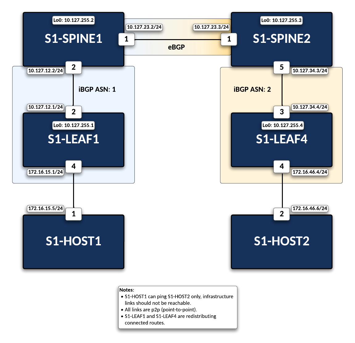 This lab has been limited to the following devices: s1-Spine1, s1-Spine2, s1-Leaf1, s1-Leaf4, s1-Host1, and s1-Host2. Additional devices on this topology are out of scope for this lab.