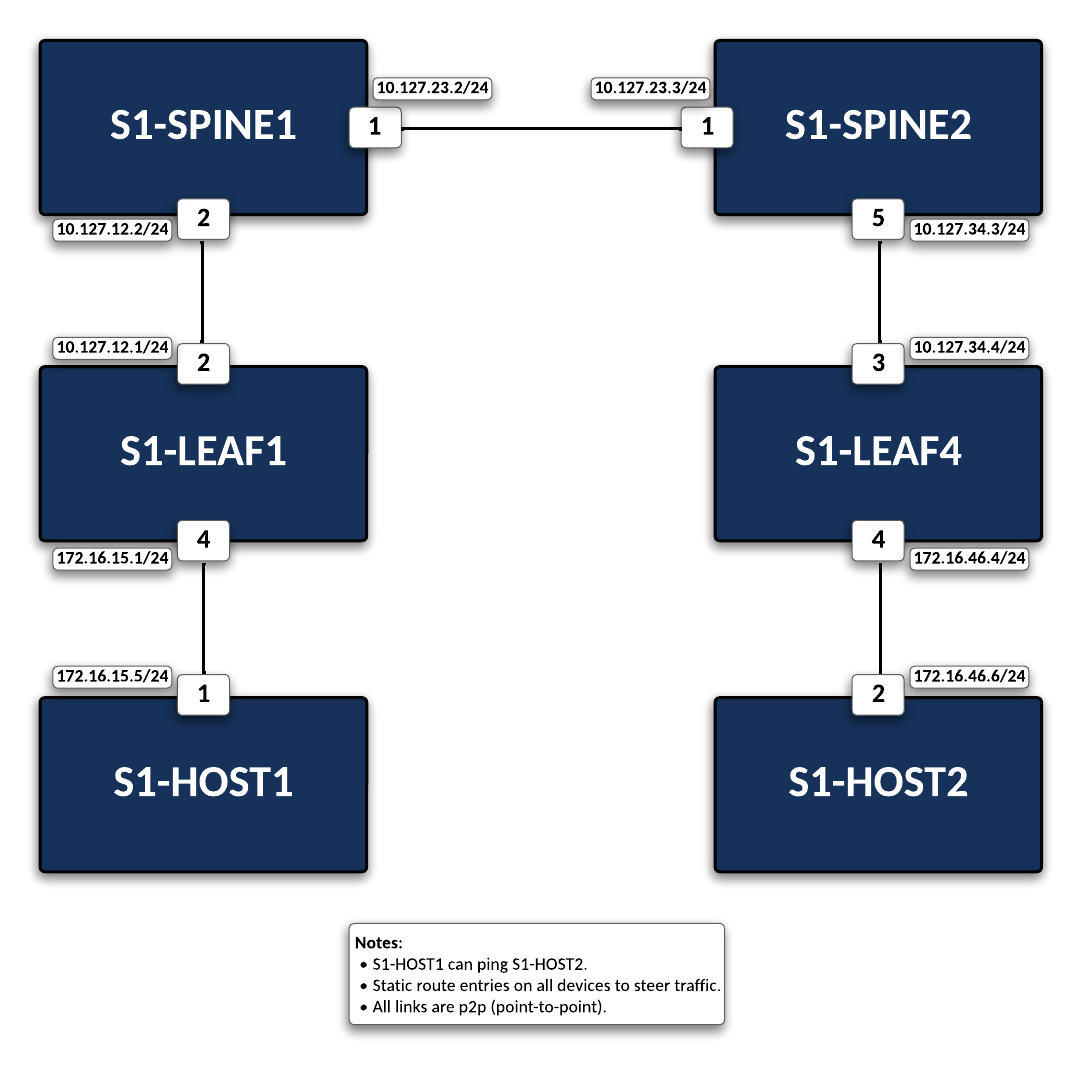 This lab has been limited to the following devices: s1-Spine1, s1-Spine2, s1-Leaf1, s1-Leaf4, s1-Host1, and s1-Host2. Additional devices on this topology are out of scope for this lab.
