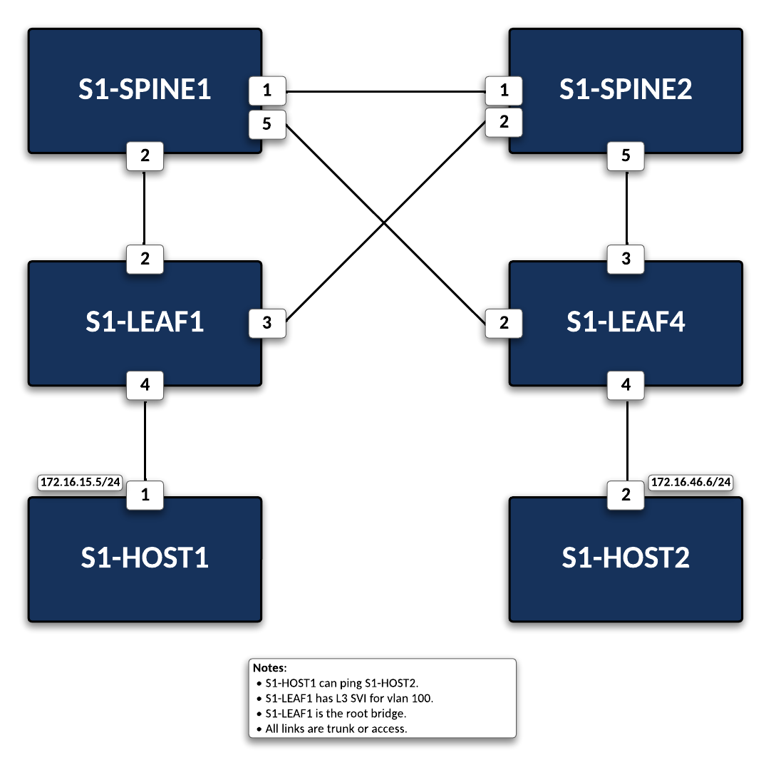1. You should see the root bridge is towards s1-Spine1 and vlan 100 should be associated to interfaces eth2, eth3, and eth4. Validate the vlan port association and spanning-tree topology is correct with the following commands: