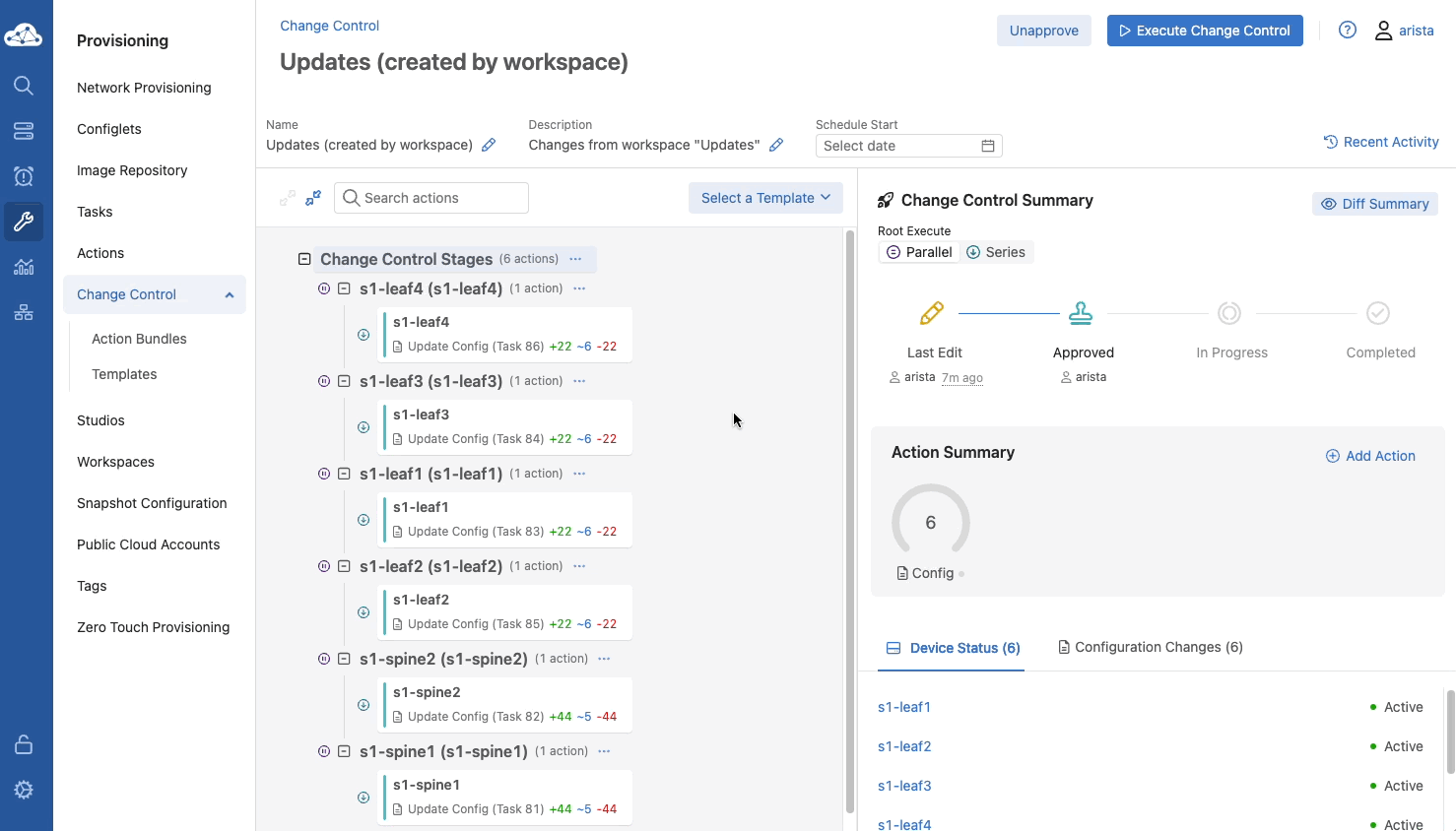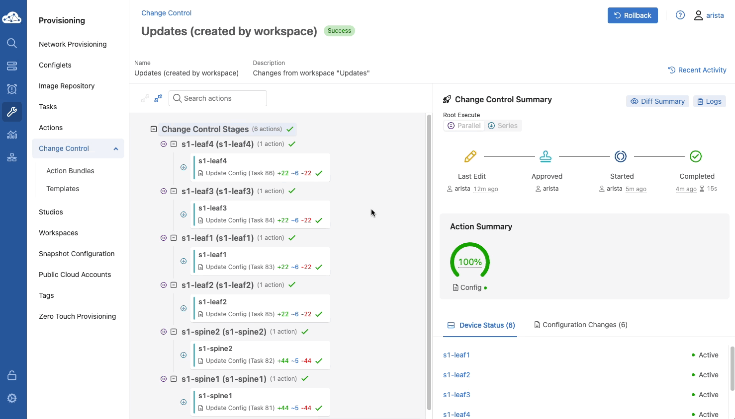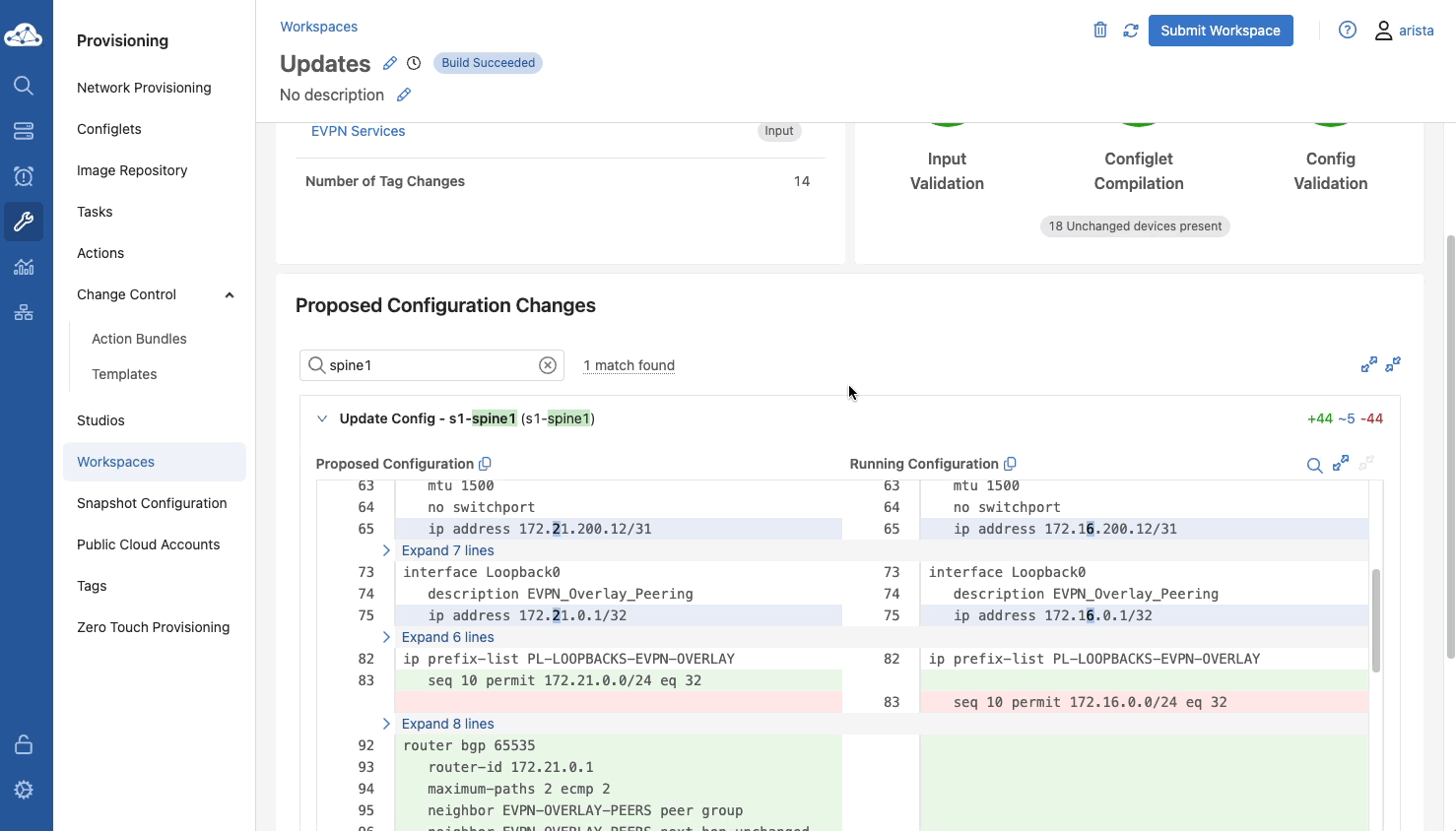 Notice that CloudVision registers and tracks all configuration changes on the device. You can select the latest change to see the configuration changes pushed via our Studios update.