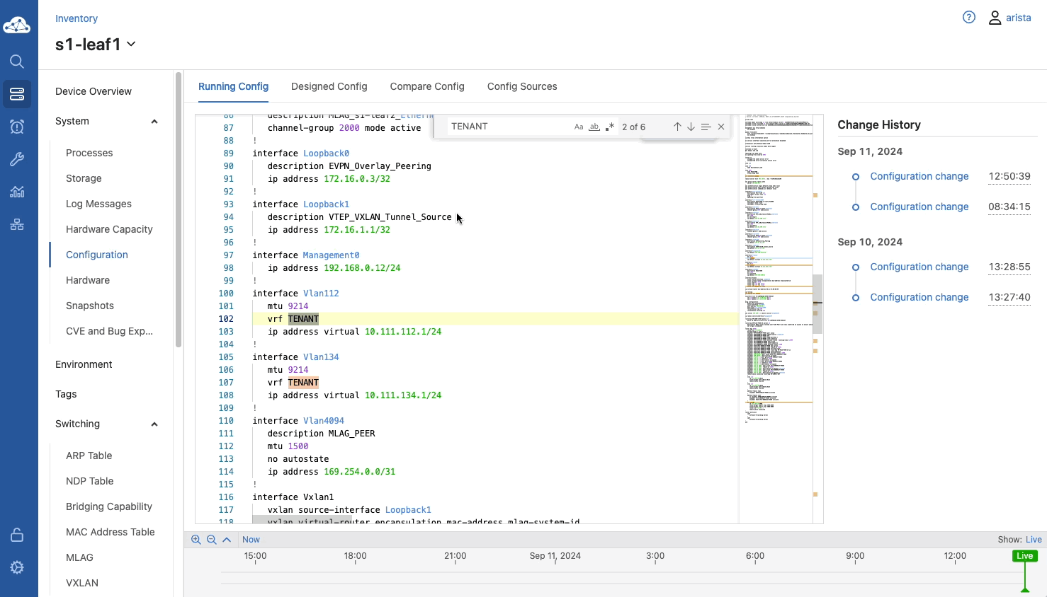 Select s1-leaf1 from the device name pull-down menu and then select Configuration in the left navigation bar. Confirm the existing VRF TENANT and that it is assigned to the two VLANs created previously, 112 and 134. You can scroll or use the Find Text option as well.