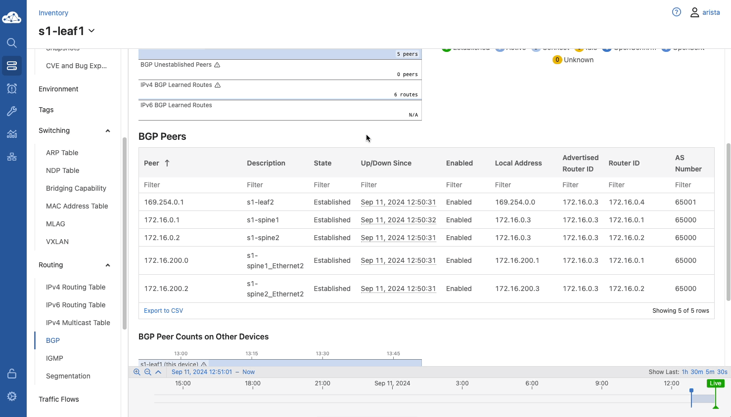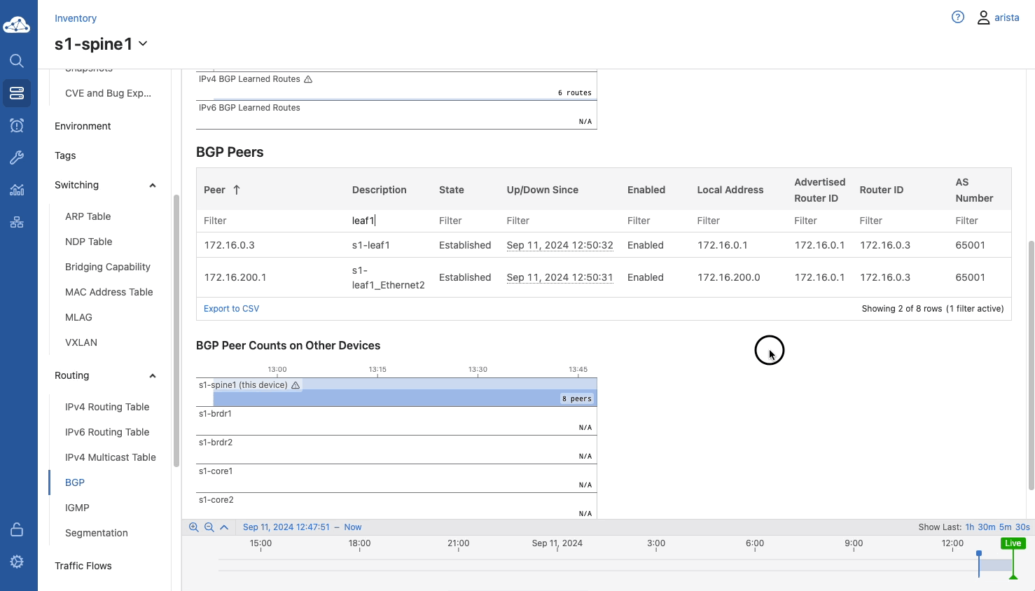 Find and click on s1-spine1, then select BGP on the left navigation bar. Here we can see the updated BGP ASN and Neighbor settings. We can also use the timeline view of BGP telemetry to see when the changes occurred.
