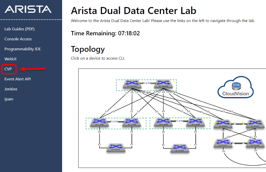 1. Click on CVP on the lab landing page to access CloudVision Portal.