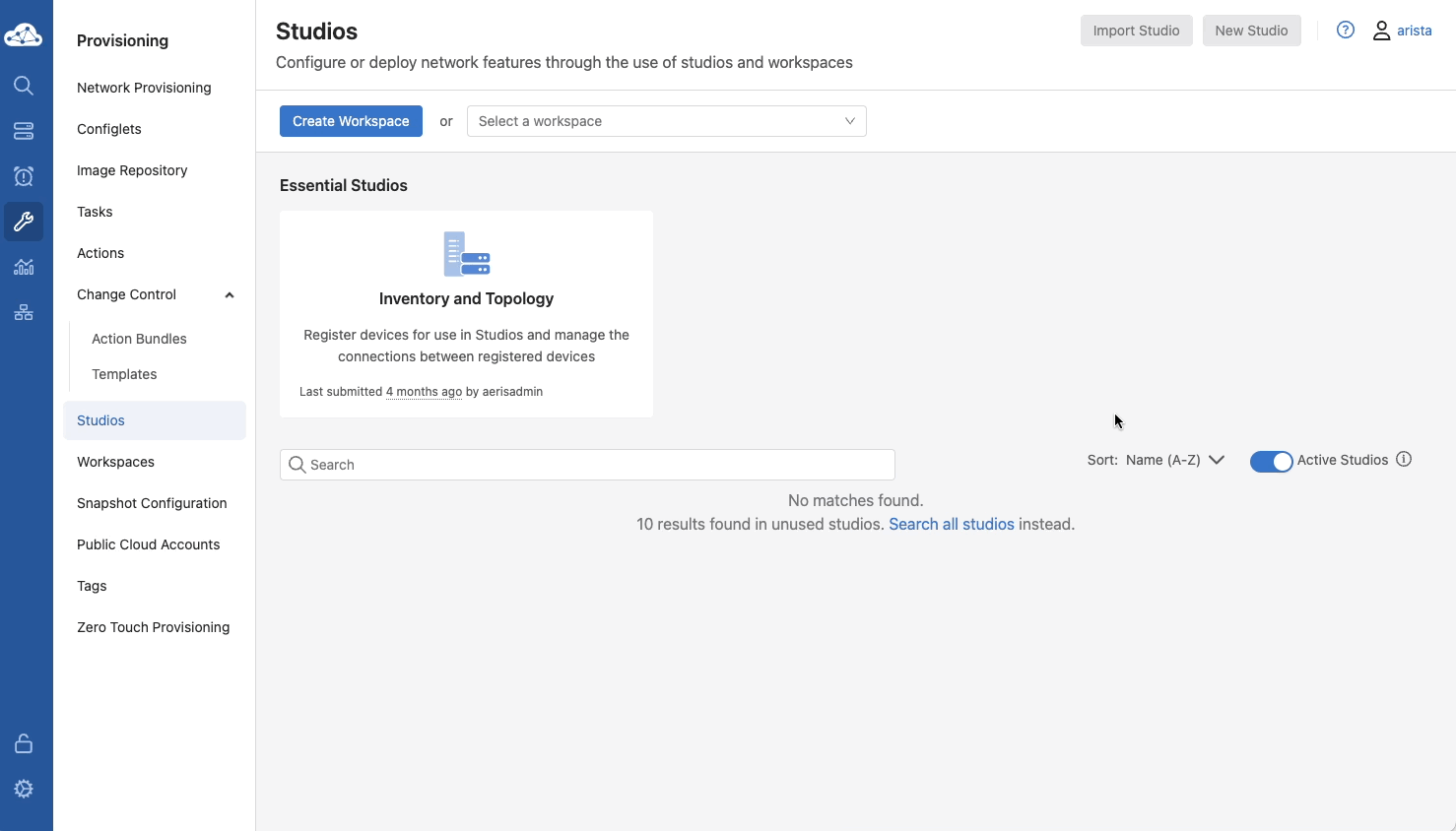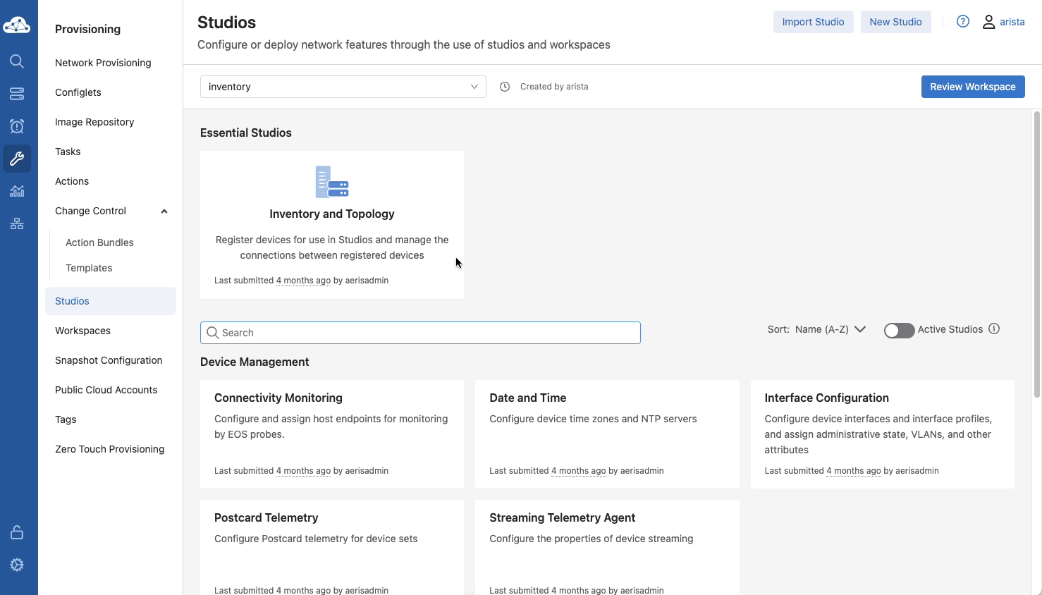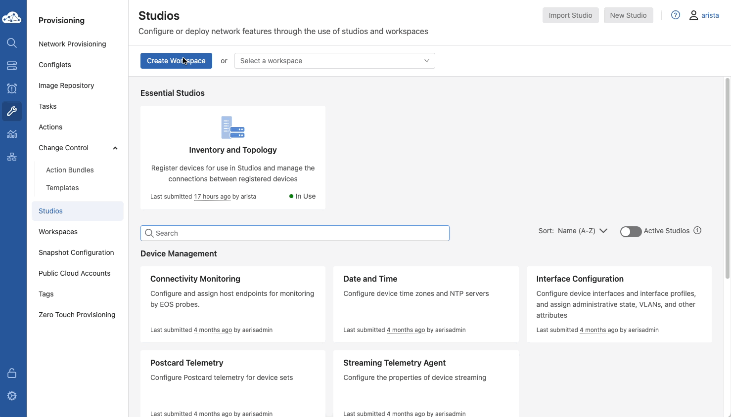 The goal of this lab is to get hands-on experience with CloudVision Studios (1) , a built-in network provisioning feature of Arista CloudVision.