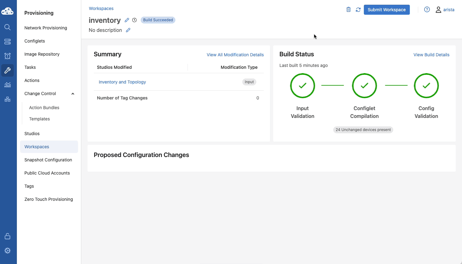 1. Click Review Workspace in the top right corner. Verify the workspace builds and validates correctly. You may also review the proposed configuration changes section to review the changes generated via the Studios workflow.