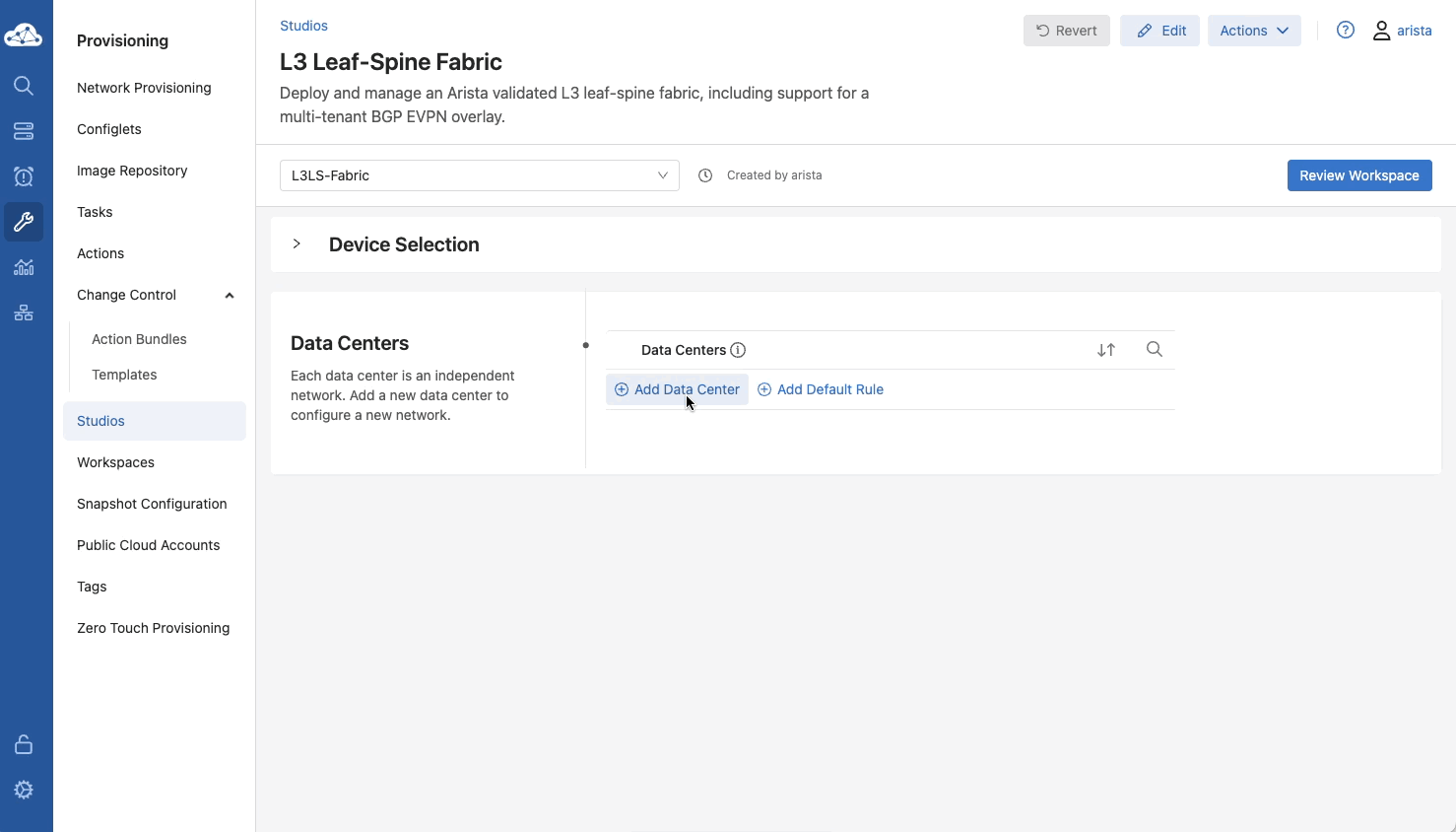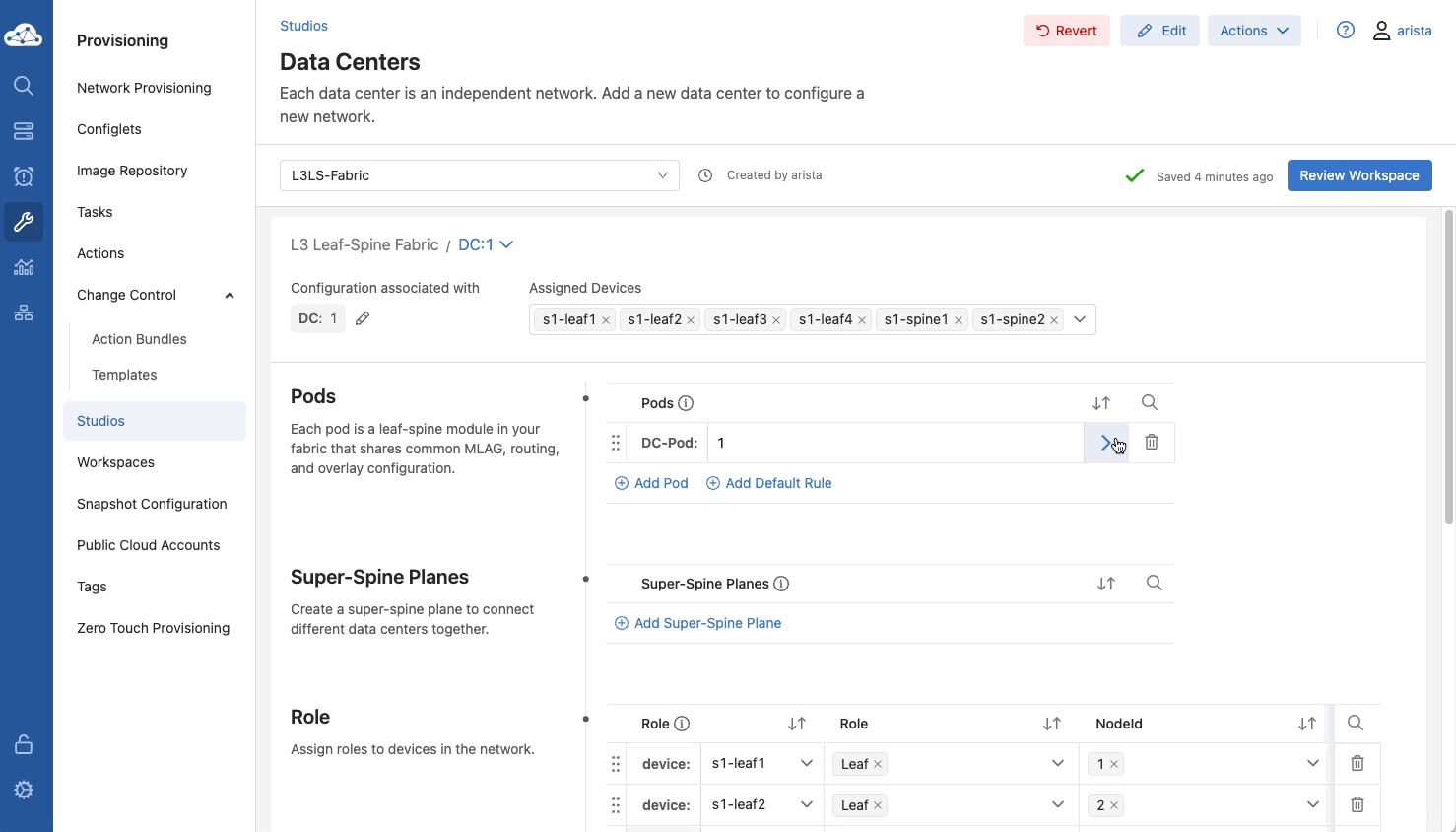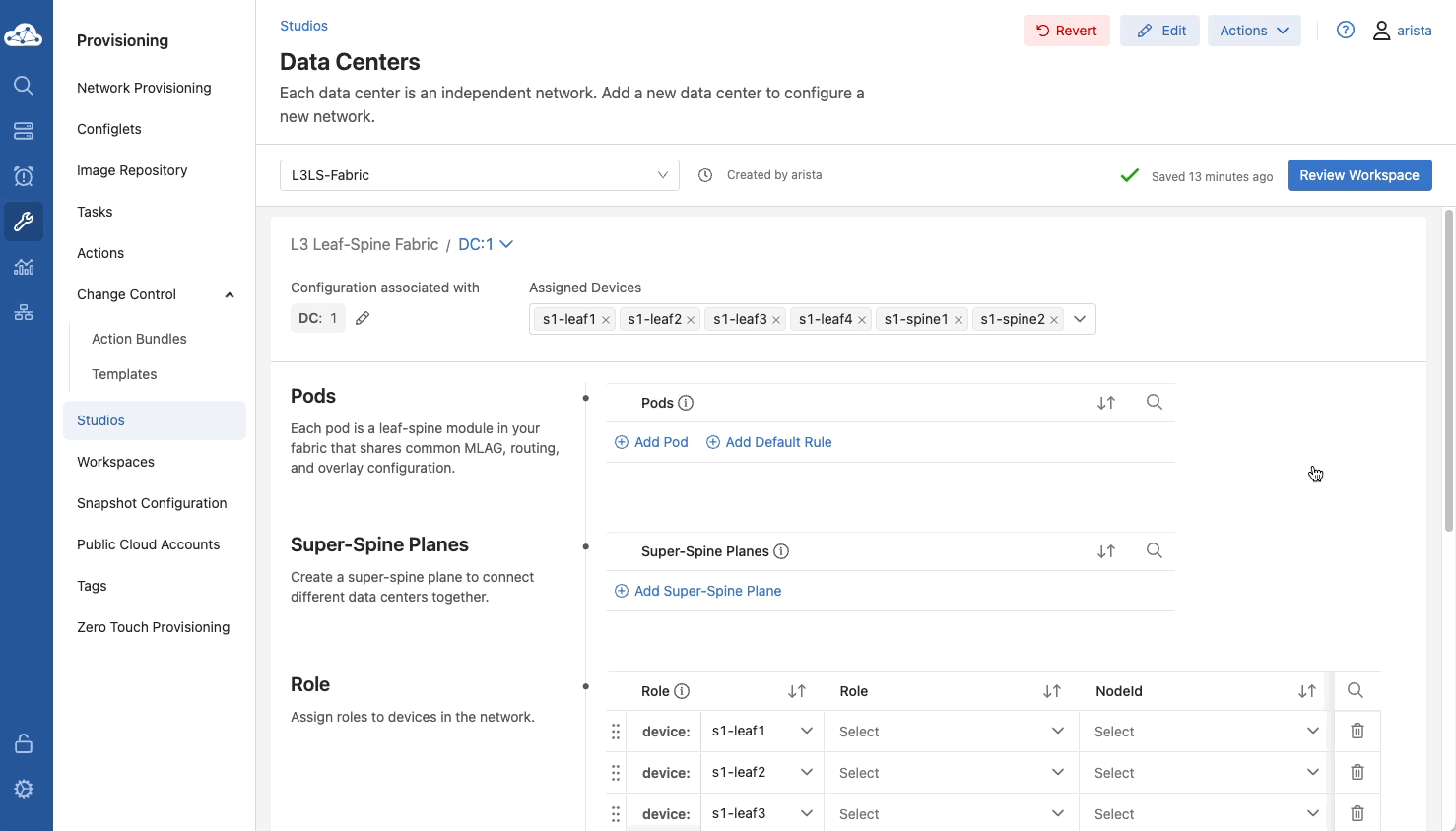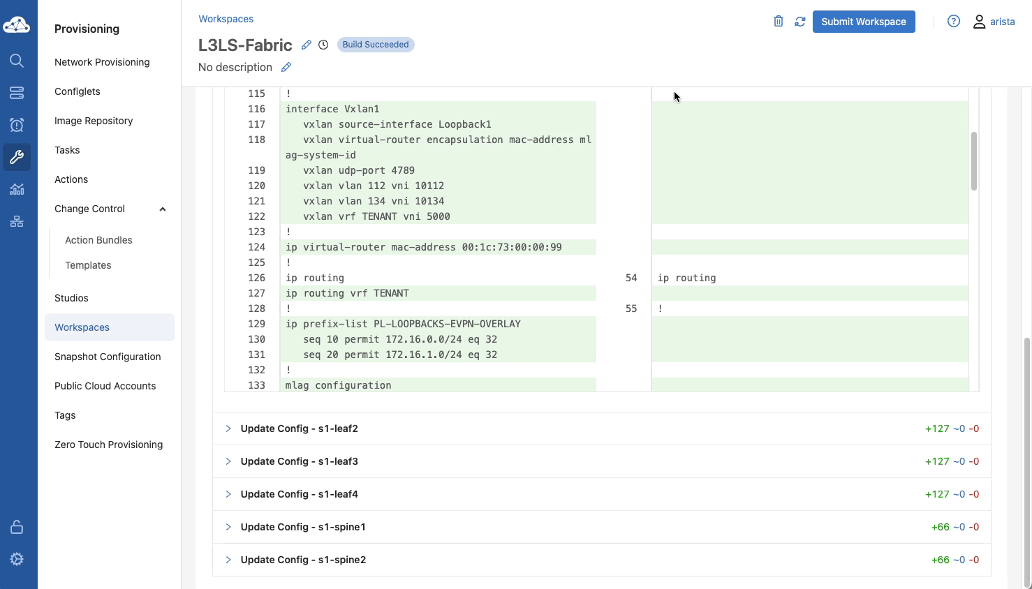Now that we've configured the required settings, we will use the workflow to build and submit our Workspace changes which will render and assign configuration to the switches in our fabric. We will then deploy this configuration into production using a Change Control in CloudVision.