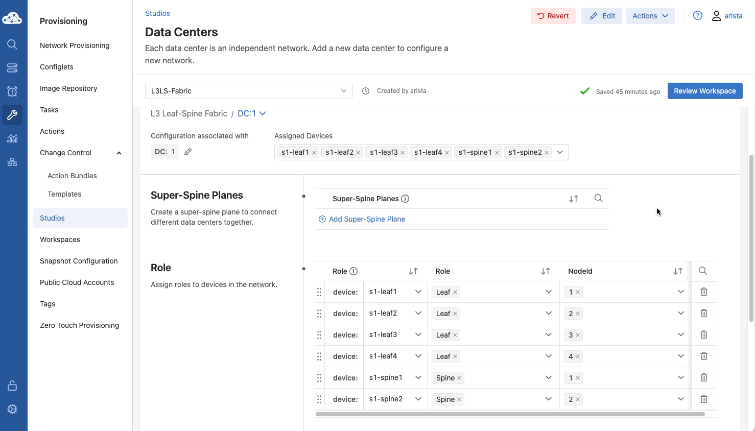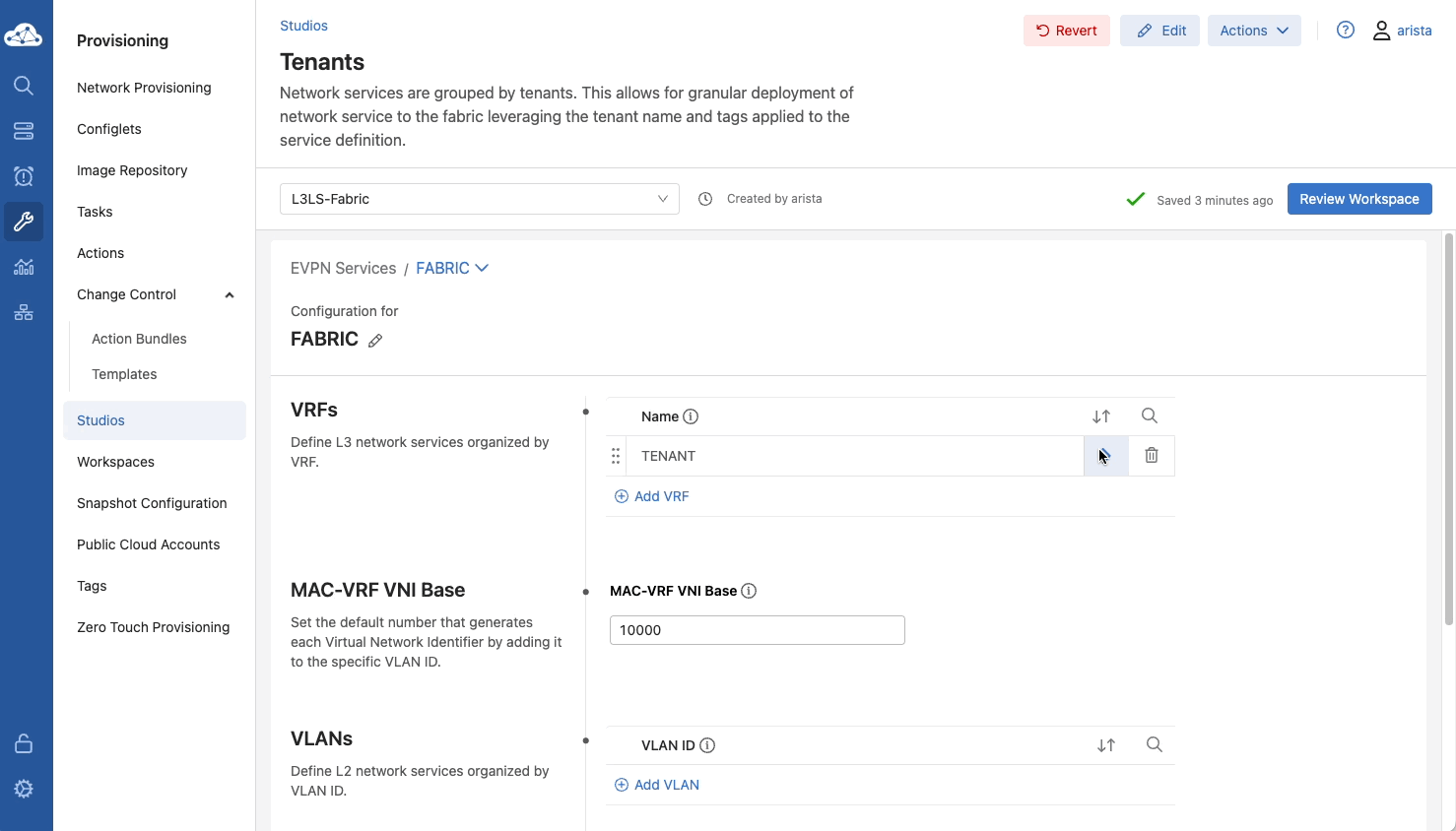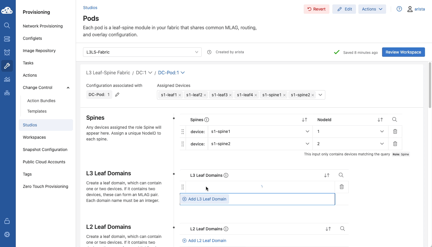 Now that we've configured the required settings, we will use the workflow to build and submit our Workspace changes which will render and assign configuration to the switches in our fabric. We will then deploy this configuration into production using a Change Control in CloudVision.