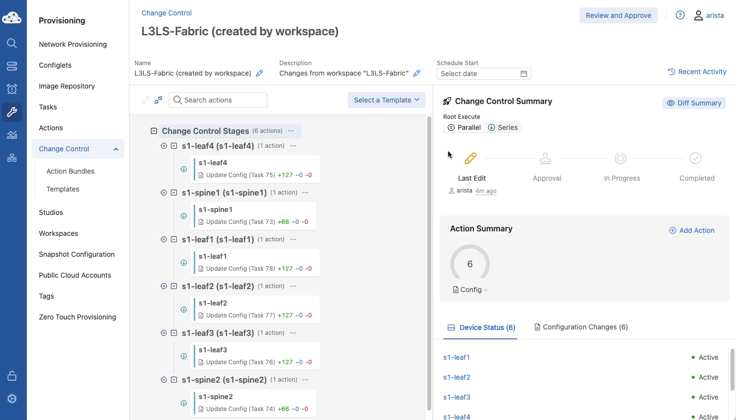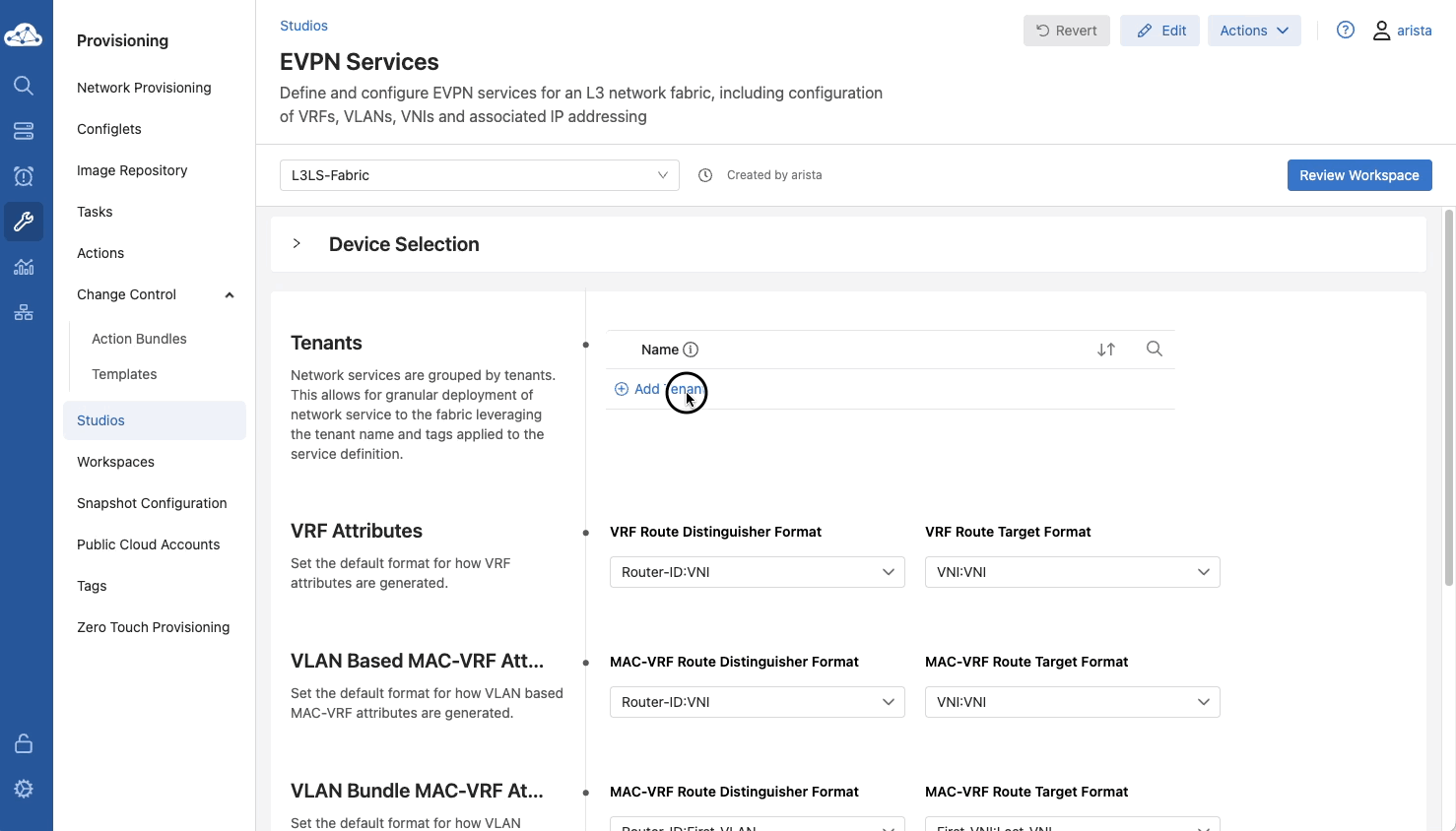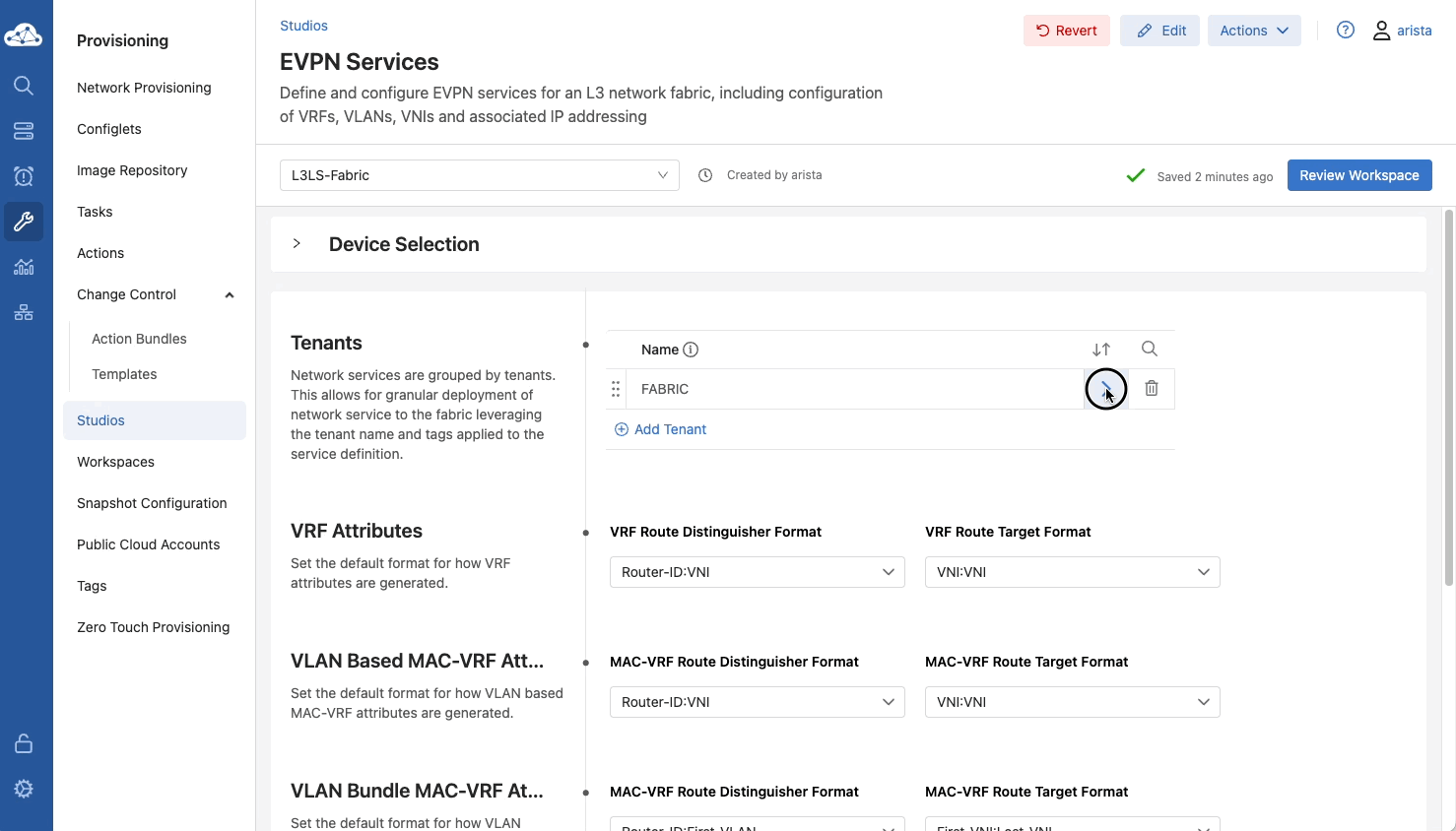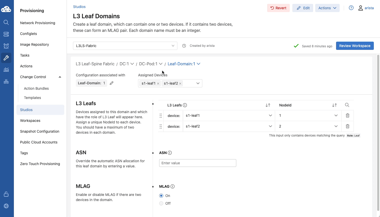Now that we've configured the required settings, we will use the workflow to build and submit our Workspace changes which will render and assign configuration to the switches in our fabric. We will then deploy this configuration into production using a Change Control in CloudVision.