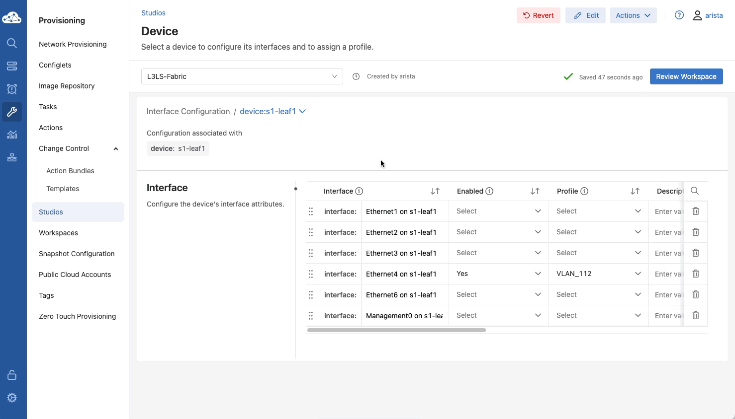 6. Find the row for Ethernet4 on s1-leaf1 and use the pull-down menus to set Enabled to Yes and Profile to VLAN_112.