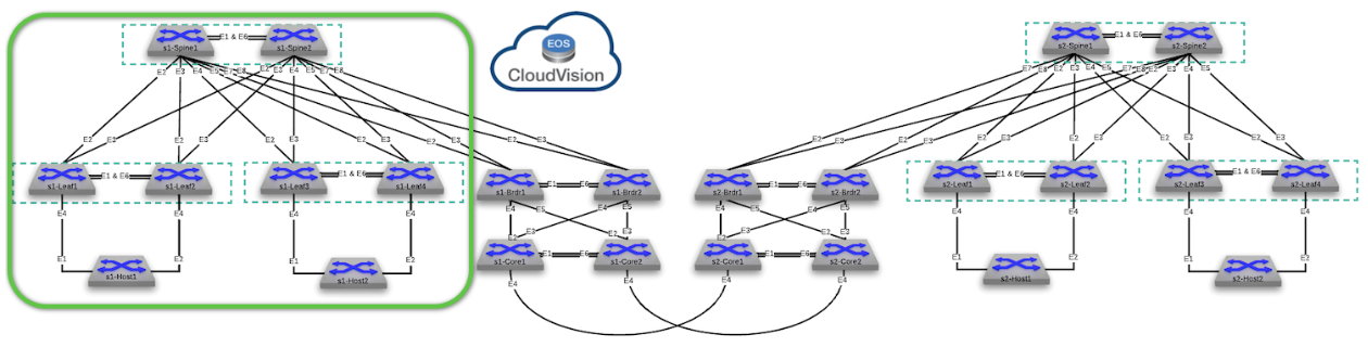 Site one of this lab consists of two spines, four leafs and two ”hosts”. The hosts are virtual EOS devices that allow us to initiate traffic for testing.