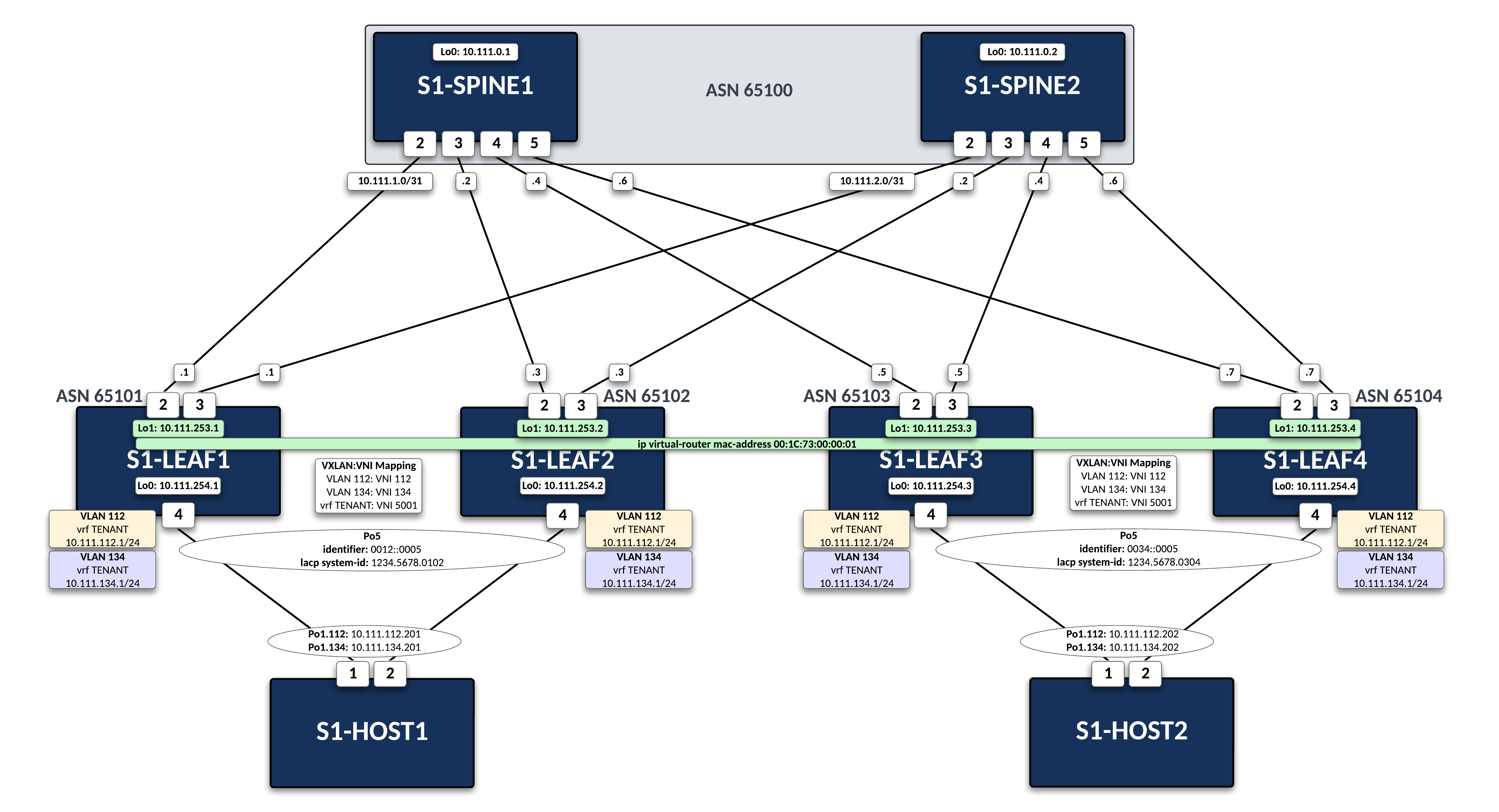 This lab exercise is focused on the VXLAN EVPN configuration. IP addresses, MLAG and BGP Underlay are already configured.