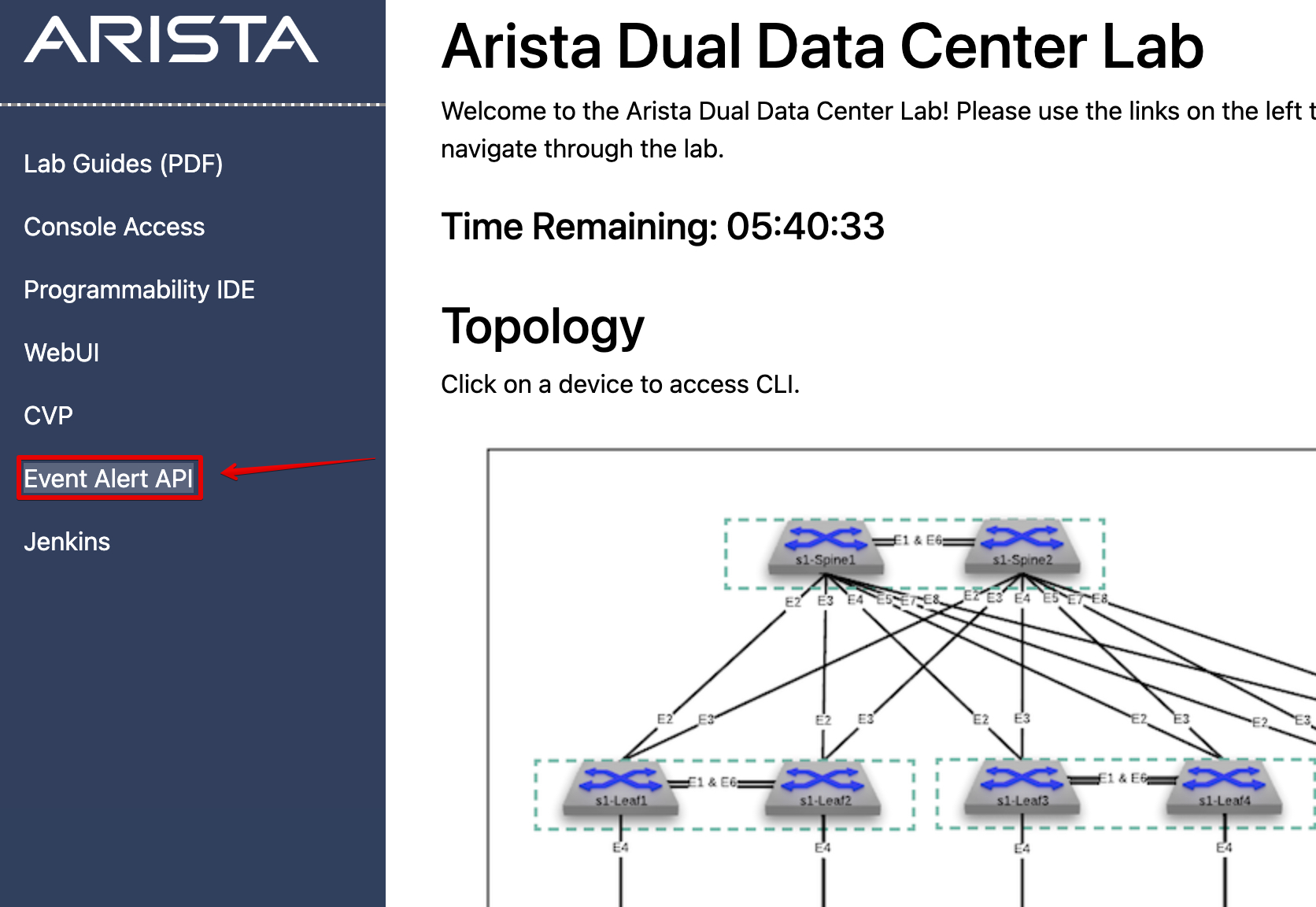 Now go back to your lab landing page and click on Event Alert API link.